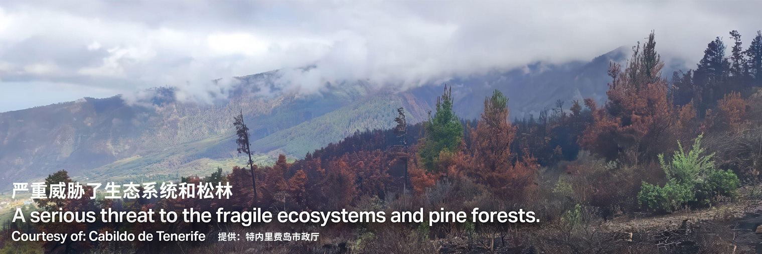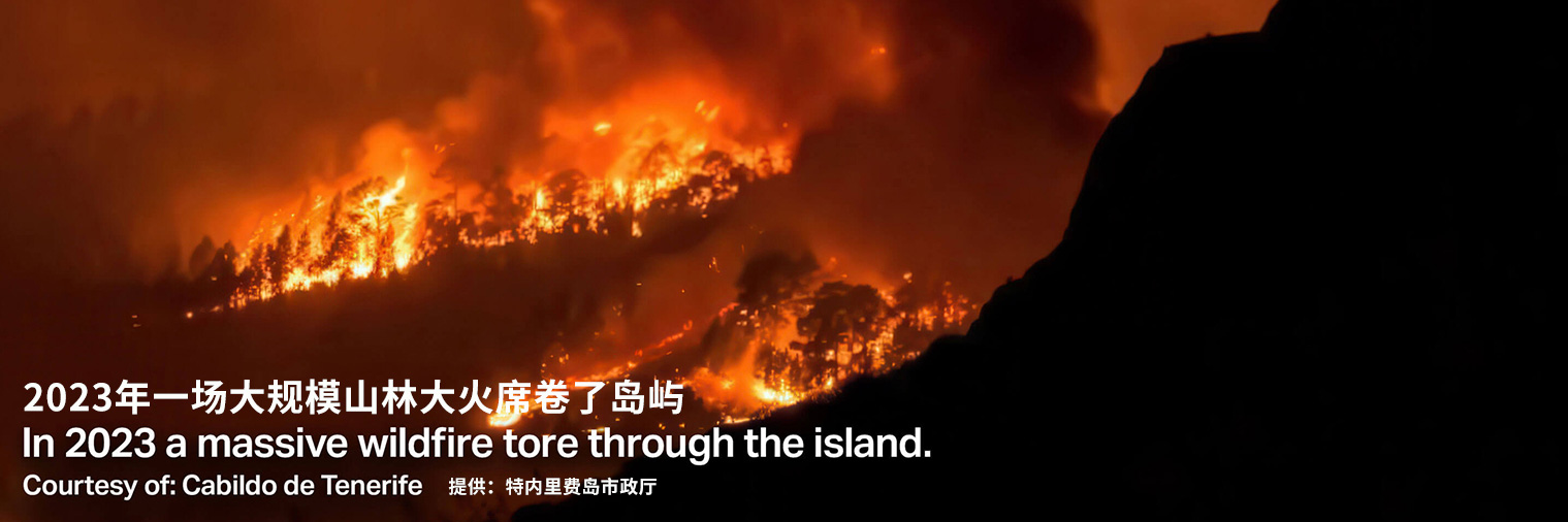 西班牙加那利群島中最大的島嶼--特內里費島,在這個被聯(lián)合國教科文組織列為世界遺產的地方,古老的綠色與火山地貌相融合,陽光穿透薄霧籠罩的山巒,延伸至連綿的松林。然而,由于炎熱的氣候和松林的組合,這種美麗的風景很容易發(fā)生森林火災。